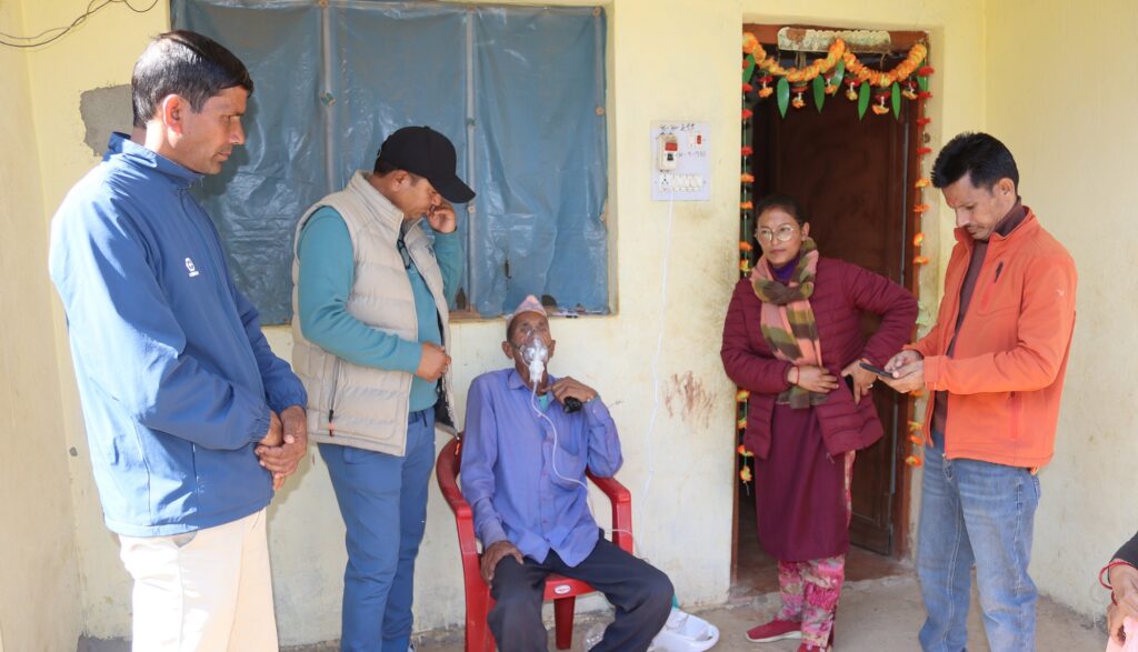 सोही ठाउँका ६५ वर्षीय कर्ण बहादुर बलायरमा स्वास प्रस्वासको समस्या देखियो । उहाँ घरमा लामो स्वास लिदै खोक्दै बस्नु भएको थियो । स्वास्थ्यकर्मीको टोलीले उहाँको चेकजाँच ग¥यो र नेवुलाइजर मसिनबाट वाफ दियो । उहाँलाई नियमित वाफ लिन नजिकैको सवास्थ्य संस्थामा आउन सुझाव दिदै औषधि दिएर जेष्ठ नागरिक भएको अर्को घरमा पस्यो ।