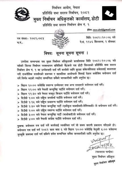 मुख्य निर्वाचन अधिकृतको कार्यालय डोटीले सोमबार सूचना जारी गर्दै सुरक्षा संवेदनशीलतालाई मध्यनजर गर्दै राजनीतिक दलहरूको सहमति र समन्वयमा मनोनयन दर्ता गरिने जनाएको छ। जिल्ला निर्वाचन व्यवस्थापन समितिको बैठकले उम्मेदवार मनोनयनका लागि दलअनुसार फरक–फरक समय तोकेको हो।