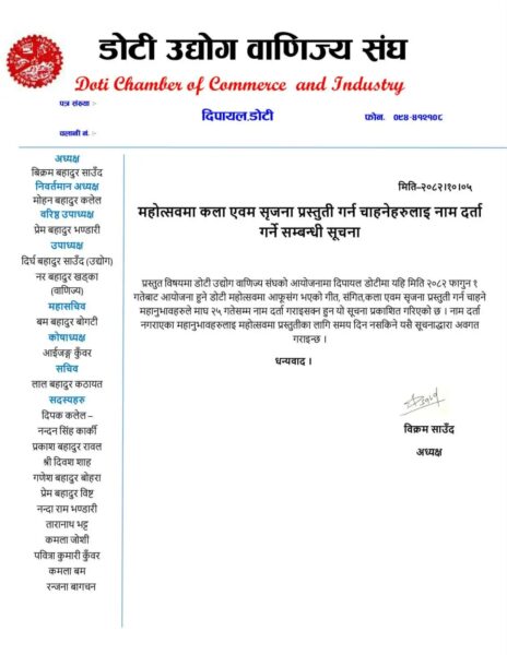 दिपायल- डोटी उद्योग वाणिज्य संघको आयोजनामा दिपायल, डोटीमा सञ्चालन हुने डोटी महोत्सवका अवसरमा गीत, संगीत, कला तथा सृजनात्मक प्रस्तुति दिन इच्छुक स्रष्टा तथा कलाकारहरूलाई नाम दर्ता गर्न आह्वान गरिएको छ।